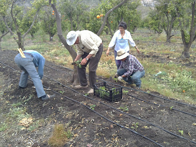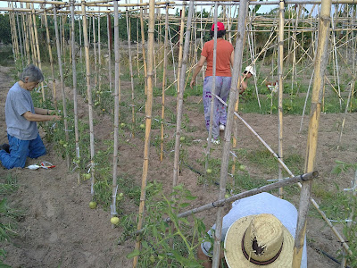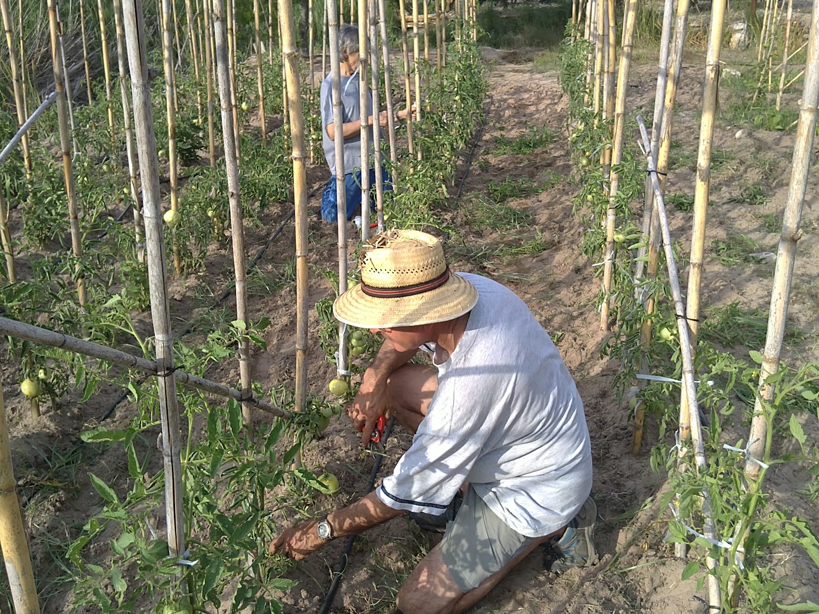 Salvador cortando los ojos de la tomateras y Roberto anudando con las cañas en la zona de la arena