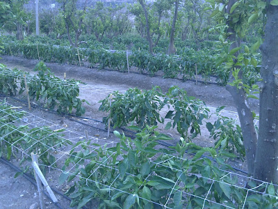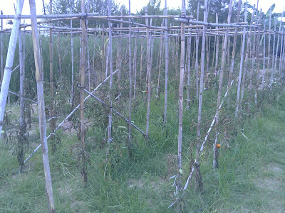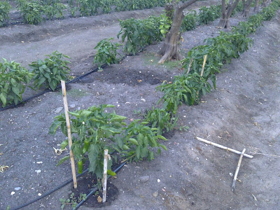 Los pimientos italianos. La malla se a terminado y tocara hacer los tutores con cañas. En la imagen faltarian dos cañas transversales, que den consistencia a las plantas.