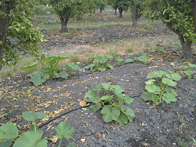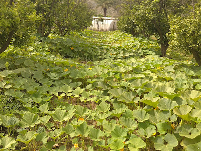 Las calabazas, aunque parece que van ha salir pocas pues casi todas las flores son macho y las que producen el fruto son las hembra, da gusto ver la zona donde están, con esas hojas tan grandes tiñendo de verde todo el suelo.