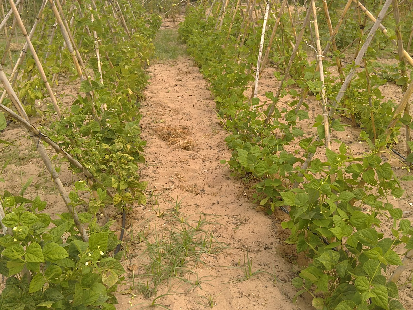 De fondo Marga y Stella quitando hierbas entre las matas de judías