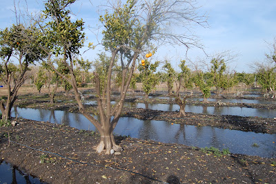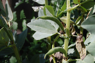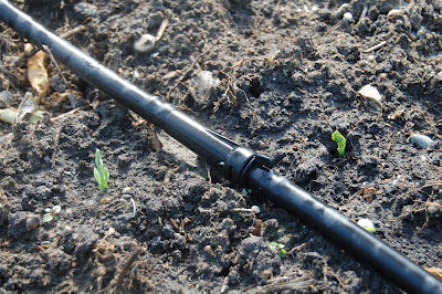 Con la primavera, también han llegado las lluvias. Aquí se puede ver la hilera de guisantes ya con los tutores